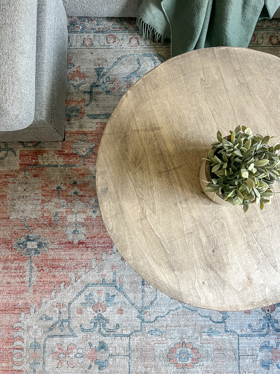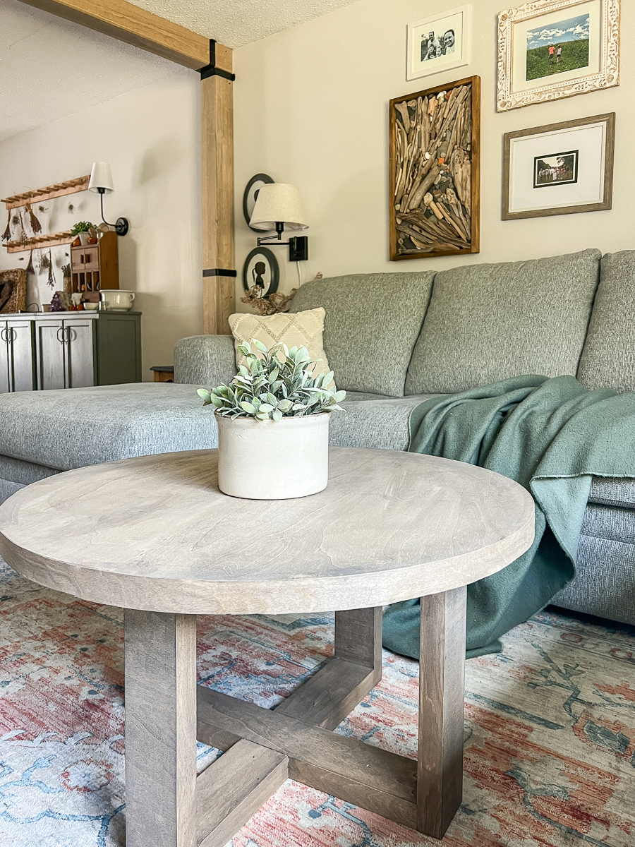 Finding a round coffee table, the right size and one I liked was hard! When I purchased our new couch the old coffee table wouldn’t work. I am now working with limited space between the chaise parts of the couch so It couldn’t be big and I wanted round to soften the lines from the square look the couch.