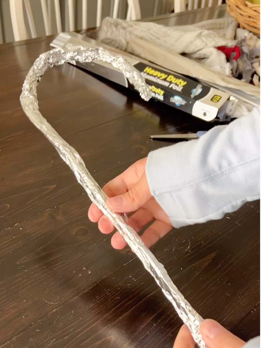 I cut about and 18″ piece of foil and put two cardboard pieces diagonally on the corner of the foil and started to roll it. When it got to the spot where there was a triangle of foil left I cut that and laid the candy candy about 2″ into it and rolled that around the top and curved it into the candy cane shape.