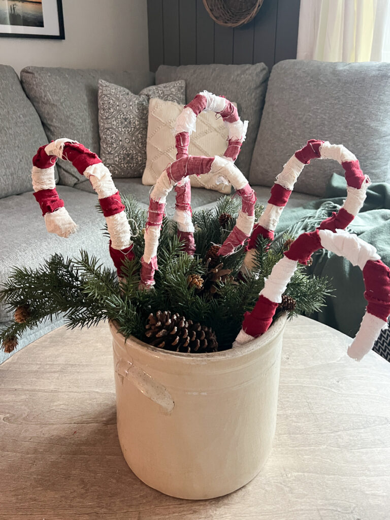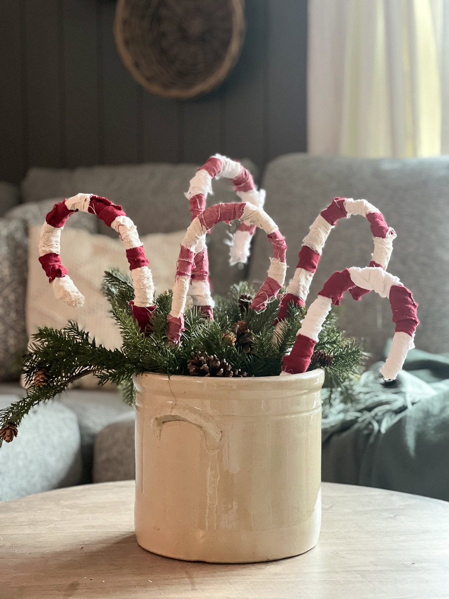 This year I saw picture of someone who bought a large plastic candy cane and wrapped it in string. I liked the homemade look but I didn’t want to buy anything. I looked around the house and in my craft bin of what I already have and these rustic, homemade candy canes came out so perfect.